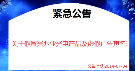 三、 嚴(yán)正聲明:凡假冒興兆業(yè)光電名義的單位或個(gè)人,必須立即停止一切侵權(quán)行為。興兆業(yè)光電保留進(jìn)一步追究其法律責(zé)任的權(quán)利。同時(shí)歡迎各位代理商、分銷商、消費(fèi)者和其它知情人員踴躍檢舉不實(shí)宣傳與不實(shí)銷售活動(dòng),對(duì)遭遇的違法行為及時(shí)報(bào)警。謝謝合作!
