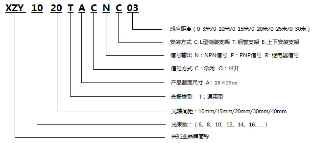 就舉一個(gè)小例子,XZY1020TACNC03,其代表的意思是,XZY是指興兆業(yè)品牌的簡稱;10表示的是安全光柵光束數(shù):(6、8、10、12、14、16……);20表示的是安全光幕的光軸間距:10mm/15mm/20mm/30mm/40mm,作為專業(yè)的安全光幕廠家,其他的光軸間距都是可以定制的;T代表的是光柵類型,T:通用型,B:小型,C:超薄型;A表示安全光柵產(chǎn)品截面尺寸, A : 35×35mm,B:29*30mm,C:18*35mm;C表示信號(hào)方式, C:常閉, O:常開;N表示安全光柵的信號(hào)輸出,N:NPN信號(hào),P:PNP信號(hào),R : 繼電器信號(hào);C表示的是安全光柵的安裝方式,C: L型側(cè)裝支架,T: 鋼管支架 E: 上下安裝支架 ;03表示的是安全光幕的感應(yīng)距離(0-3米/0-10米/0-15米/0-20米/0-25米/0-30米)。下面,就用圖片示意說明,希望讓您一目了然的了解我們興兆業(yè)安全光幕的型號(hào)。