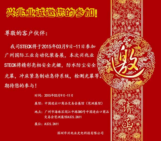 本次展會(huì),興兆業(yè)將積極部署,全方位考量用戶關(guān)心的問(wèn)題,從用戶本位出發(fā)精心策劃。在展位的設(shè)計(jì)和布置上力求凸顯以用戶為中心的興兆業(yè)STECK特色,彰顯安全光柵安全、環(huán)保、防水防塵等,以新穎的構(gòu)思、簡(jiǎn)約而不簡(jiǎn)單的設(shè)計(jì)風(fēng)格,力求帶給參觀者更具深度的互動(dòng)體驗(yàn)。本次興兆業(yè)STECK將精彩亮相安全光柵,防水防塵安全光幕,沖床緊急制動(dòng)急停系統(tǒng),檢測(cè)光幕,相信興兆業(yè)的安全光柵為民眾帶來(lái)驚喜,同時(shí)也將為2015廣州國(guó)際工業(yè)自動(dòng)化技術(shù)增光添彩!同時(shí),在展會(huì)期間,興兆業(yè)STECK的知名工程師、技術(shù)測(cè)試師,名牌客服等將悉數(shù)到場(chǎng),與來(lái)賓分享興兆業(yè)的安全光柵、測(cè)量光柵,探討、洽談相關(guān)產(chǎn)品合作等,歡迎各位前來(lái)E17展號(hào)廳進(jìn)行參觀、咨詢、研究、探討!